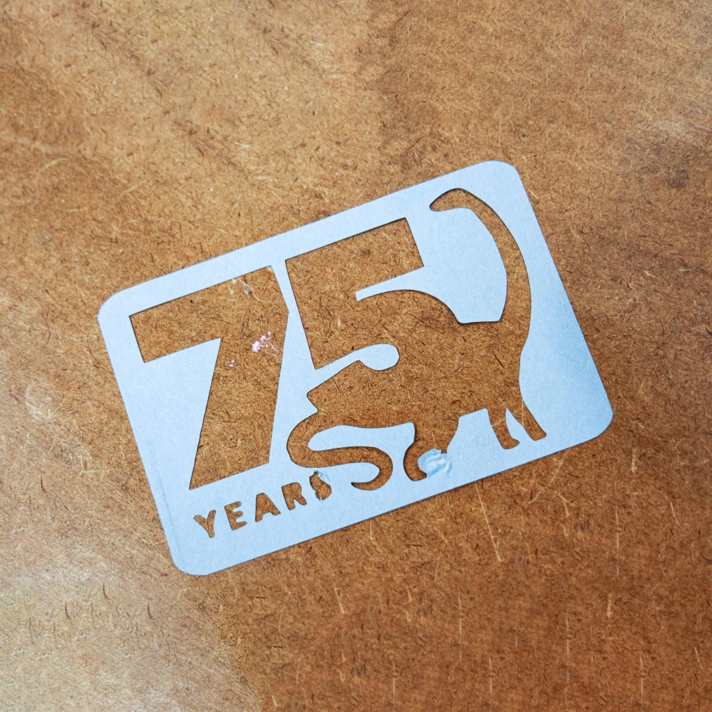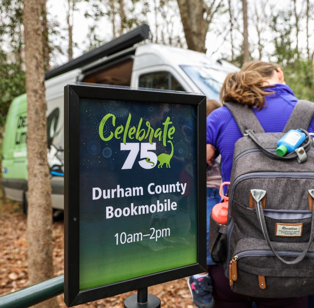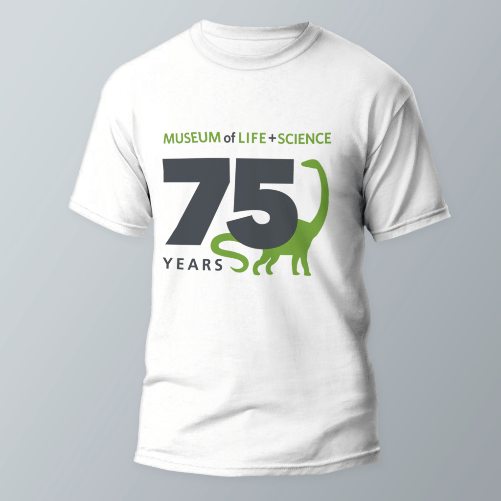 As one of the oldest operating museums in Durham, the Museum has had a lasting impact on the city of Durham and broader community. I chose to use a bold “75” to represent the expansive history. Gazing back, the dinosaur strolls forward while reminiscing on history of the ground laid by the local monolith.